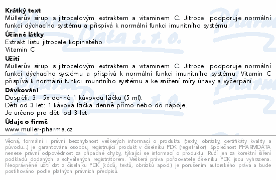 Müllerův sirup s jitrocelovým extraktem a vitaminem C. Jitrocel podporuje normální funkci dýchacího systému a přispívá k normální funkci imunitního systému.