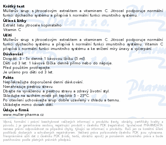 Müllerův sirup s jitrocelovým extraktem a vitaminem C. Jitrocel podporuje normální funkci dýchacího systému a přispívá k normální funkci imunitního systému.