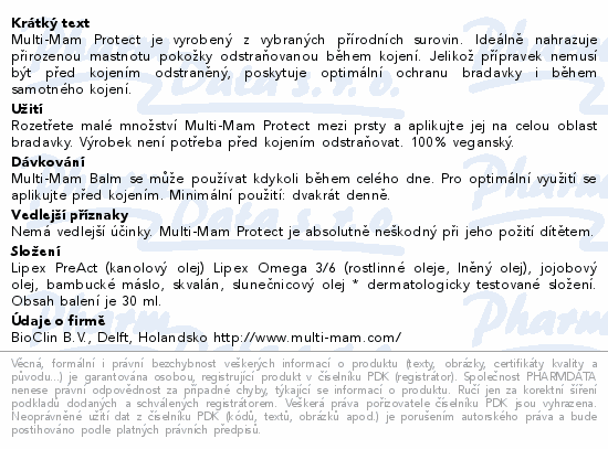 Multi-Mam Protect je vyrobený z vybraných přírodních surovin. Ideálně nahrazuje přirozenou mastnotu pokožky odstraňovanou během kojení. Jelikož přípravek nemusí být před kojením odstraněný, poskytuje optimální ochranu bradavky i během samotného kojení.