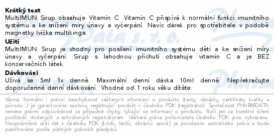 MultiIMUN Sirup obsahuje Vitamín C. Vitamín C přispívá k normální funkci imunitního systému a ke snížení míry únavy a vyčerpání. Navíc dárek pro spotřebitele v podobě magnetky lvíčka multikinga.