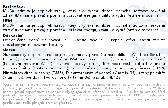 MUSA Intimita je doplněk stravy, který díky svému složení pomáhá udržovat sexuální zdraví (Damiána pravá) a pomáhá udržovat energii, vitalitu a výdrž (Vitánie snodárná).