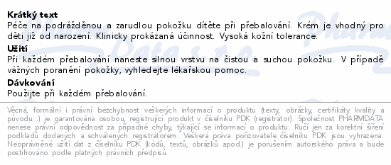 Péče na podrážděnou a zarudlou pokožku dítěte při přebalování. Krém je vhodný pro děti již od narození. Klinicky prokázaná účinnost. Vysoká kožní tolerance.
