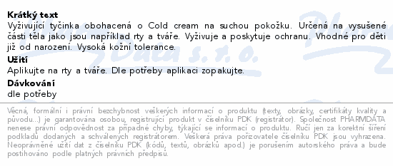 Vyživující tyčinka obohacená o Cold cream na suchou pokožku. Určená na vysušené části těla jako jsou například rty a tváře. Vyživuje a poskytuje ochranu. Vhodné pro děti již od narození. Vysoká kožní tolerance.