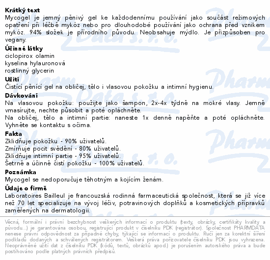 Mycogel čisticí gel je speciálně vyvinutý na citlivou pokožku vlasů, tváře, těla i intimních partií se sklonem k podráždění a k mykotickým projevům. Kyselina hyaluronová spolu s rostlinným glycerinem a s antimikrobiální složkou ciclopirox olaminem jemně a účinně čistí citlivou pokožku, zklidňuje podráždění a zmírňuje zarudnutí. Je ideální jako součást efektivní léčby mykóz nebo jako ochrana před vznikem mykóz.