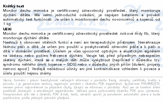 Monitor dechu miminka je certifikovaný zdravotnický prostředek, který monitoruje dýchání dítěte. Má velmi jednoduché ovládání, je napájen bateriemi a provádí automatický test funkčnosti. Je určen k monitorování dechu novorozenců a kojenců od 1 kg.