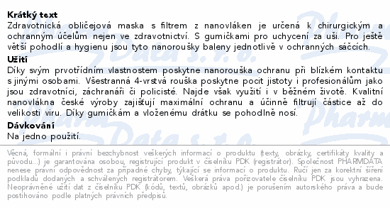 Zdravotnická obličejová maska s filtrem z nanovláken je určená k chirurgickým a ochranným účelům nejen ve zdravotnictví. S gumičkami pro uchycení za uši. Pro ještě větší pohodlí a hygienu jsou tyto nanoroušky baleny jednotlivě v ochranných sáčcích.