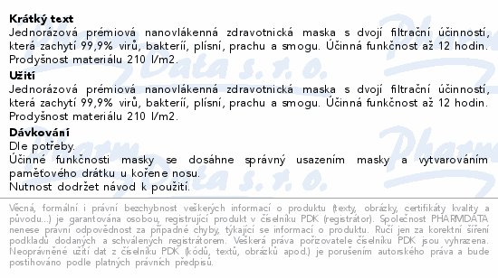 Jednorázová prémiová nanovlákenná zdravotnická maska s dvojí filtrační účinností, která zachytí 99,9% virů, bakteríí, plísní, prachu a smogu. Účinná funkčnost až 12 hodin. Prodyšnost materiálu 210 l/m2.