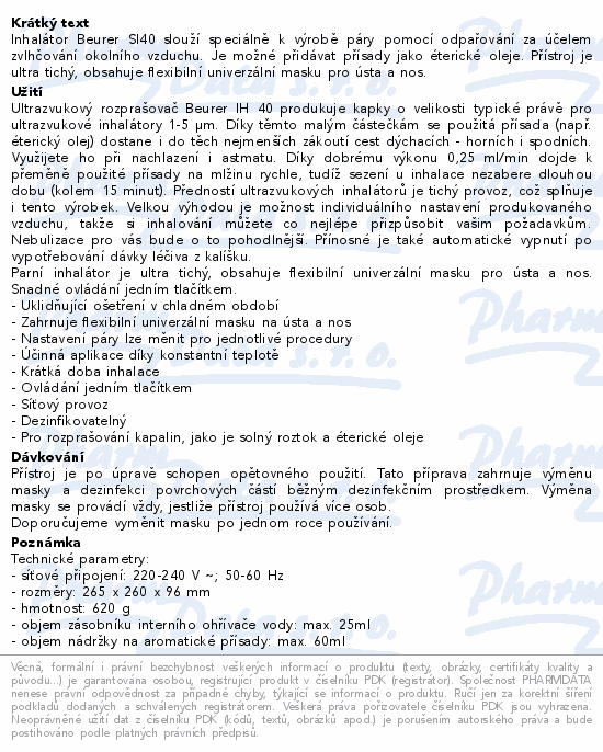 Inhalátor Beurer SI40 slouží speciálně k výrobě páry pomocí odpařování za účelem zvlhčování okolního vzduchu. Je možné přidávat přísady jako éterické oleje. Přístroj je ultra tichý, obsahuje flexibilní univerzální masku pro ústa a nos.