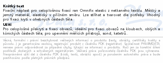 Fixační náplast pro celoplošnou fixací ran Omnifix elastic z netkaného textilu. Měkký a jemný materiál, elastický v příčném směru. Lze stříhat a tvarovat dle potřeby. Vhodný pro fixaci krytí v ohebných částech těla.
