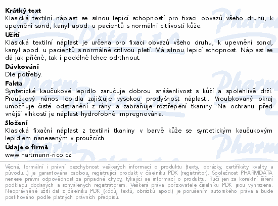 Klasická textilní náplast se silnou lepicí schopností pro fixaci obvazů všeho druhu, k upevnění sond, kanyl apod. u pacientů s normální citlivostí kůže.
