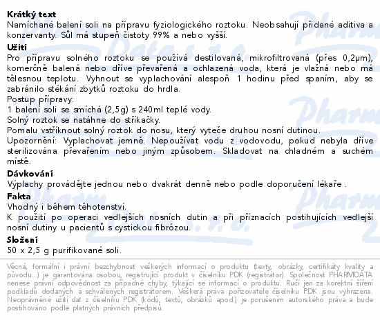 Namíchané balení soli na přípravu fyziologického roztoku. Neobsahují přidané aditiva a konzervanty. Sůl má stupeň čistoty 99% a nebo vyšší.