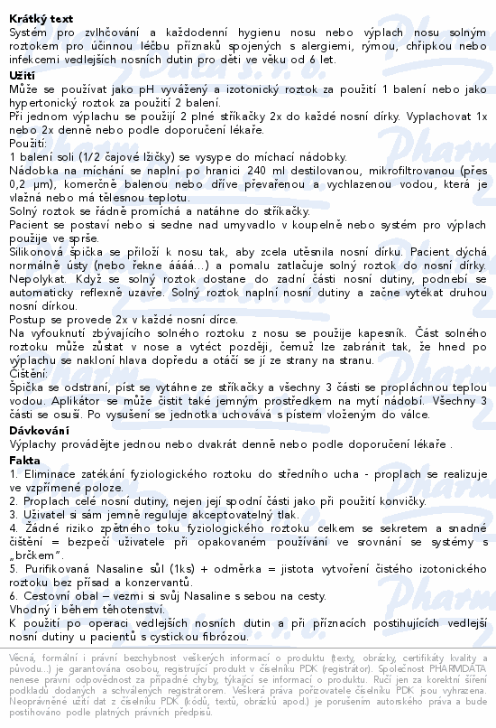 Systém pro zvlhčování a každodenní hygienu nosu nebo výplach nosu solným roztokem pro účinnou léčbu příznaků spojených s alergiemi, rýmou, chřipkou nebo infekcemi vedlejších nosních dutin pro děti ve věku od 6 let.