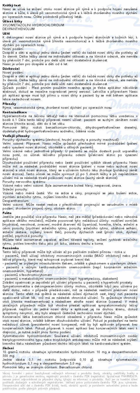 Nasic se užívá ke snížení otoku nosní sliznice při rýmě a k podpoře hojení narušené sliznice a kůže, k úlevě při vazomotorické rýmě a k léčbě zhoršeného nosního dýchání po operacích nosu. Čtěte pozorně příbalový leták.