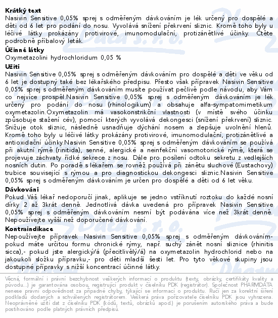 Nasivin Sensitive 0,05% sprej s odměřeným dávkováním je lék určený pro dospělé a děti od 6 let pro podání do nosu. Vyvolává snížení překrvení sliznic. Kromě toho byly u léčivé látky prokázány protivirové, imunomodulační, protizánětlivé účinky. Čtěte pozorně příbalový leták.