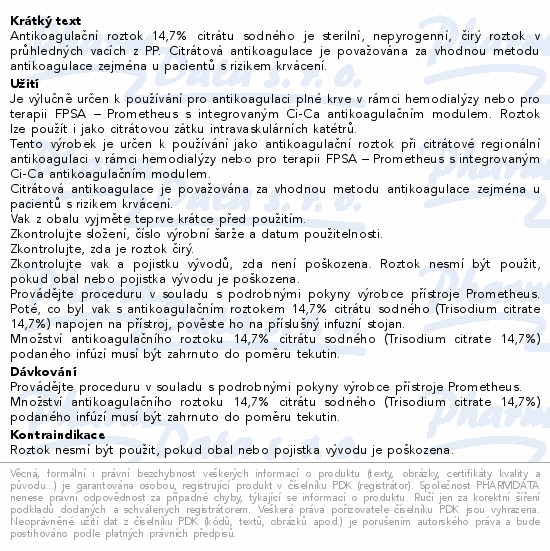 Antikoagulační roztok 14,7% citrátu sodného je sterilní, nepyrogenní, čirý roztok v průhledných vacích z PP. Citrátová antikoagulace je považována za vhodnou metodu antikoagulace zejména u pacientů s rizikem krvácení.
