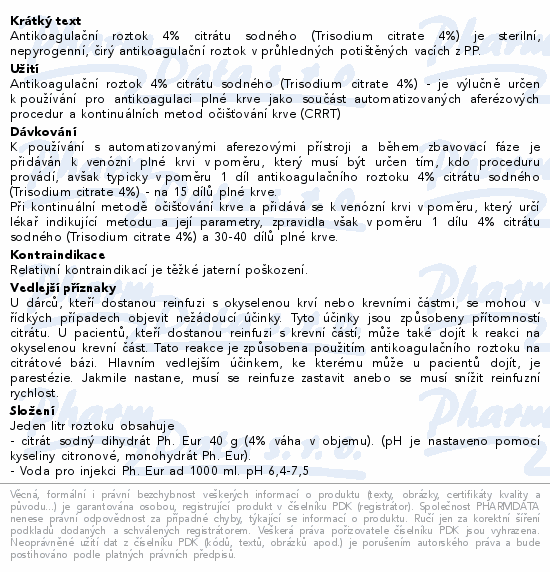 Antikoagulační roztok 4% citrátu sodného (Trisodium citrate 4%) je sterilní, nepyrogenní, čirý antikoagulační roztok v průhledných potištěných vacích z PP.