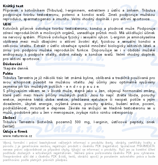 Přípravek s kotvičníkem (Tribulus), l-argininem, extraktem z ústřic a zinkem. Tribulus podporuje tvorbu testosteronu, potenci a kondici svalů. Zinek podporuje mužskou reprodukci, spermatogenezi a imunitu. Velmi vhodný doplněk i pro aktivní sportovce.