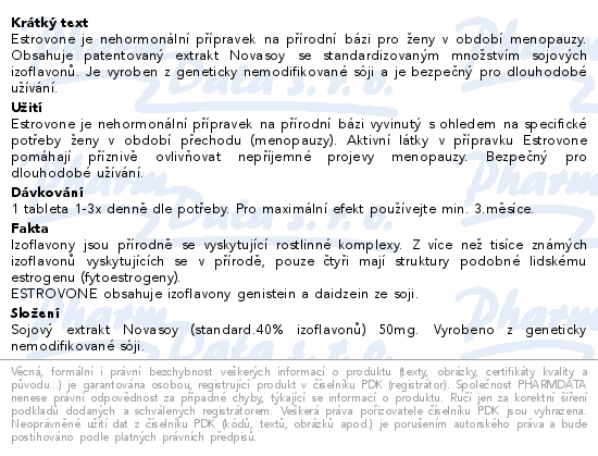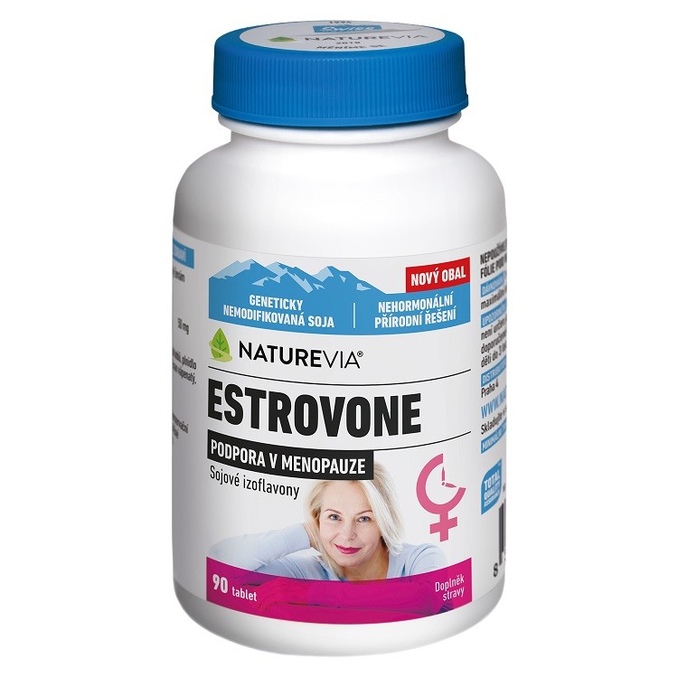 Estrovone je nehormonální přípravek na přírodní bázi pro ženy v období menopauzy. Obsahuje patentovaný extrakt Novasoy se standardizovaným množstvím sojových izoflavonů. Je vyroben z geneticky nemodifikované sóji a je bezpečný pro dlouhodobé užívání.