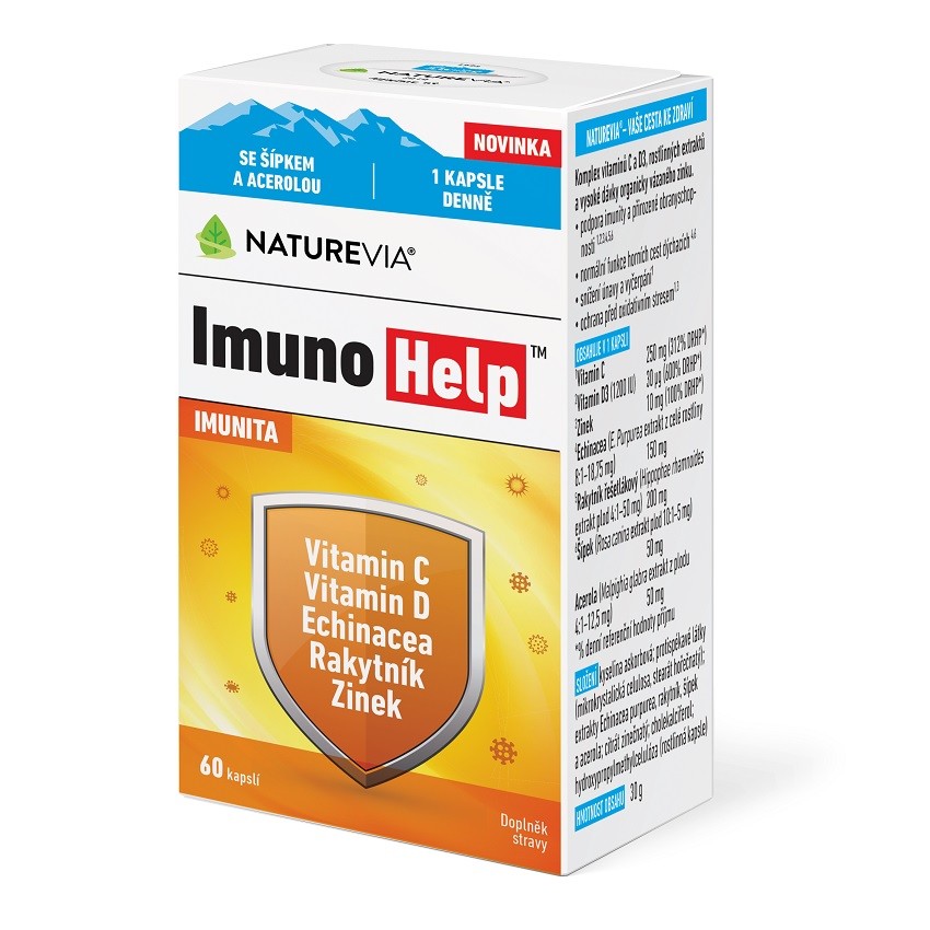 Doplněk stravy ImunoHelp obsahuje komplex vitaminů C a D3, rostlinných extraktů z echinacey, rakytníku, šípku a aceroly a organicky vázaného zinku.