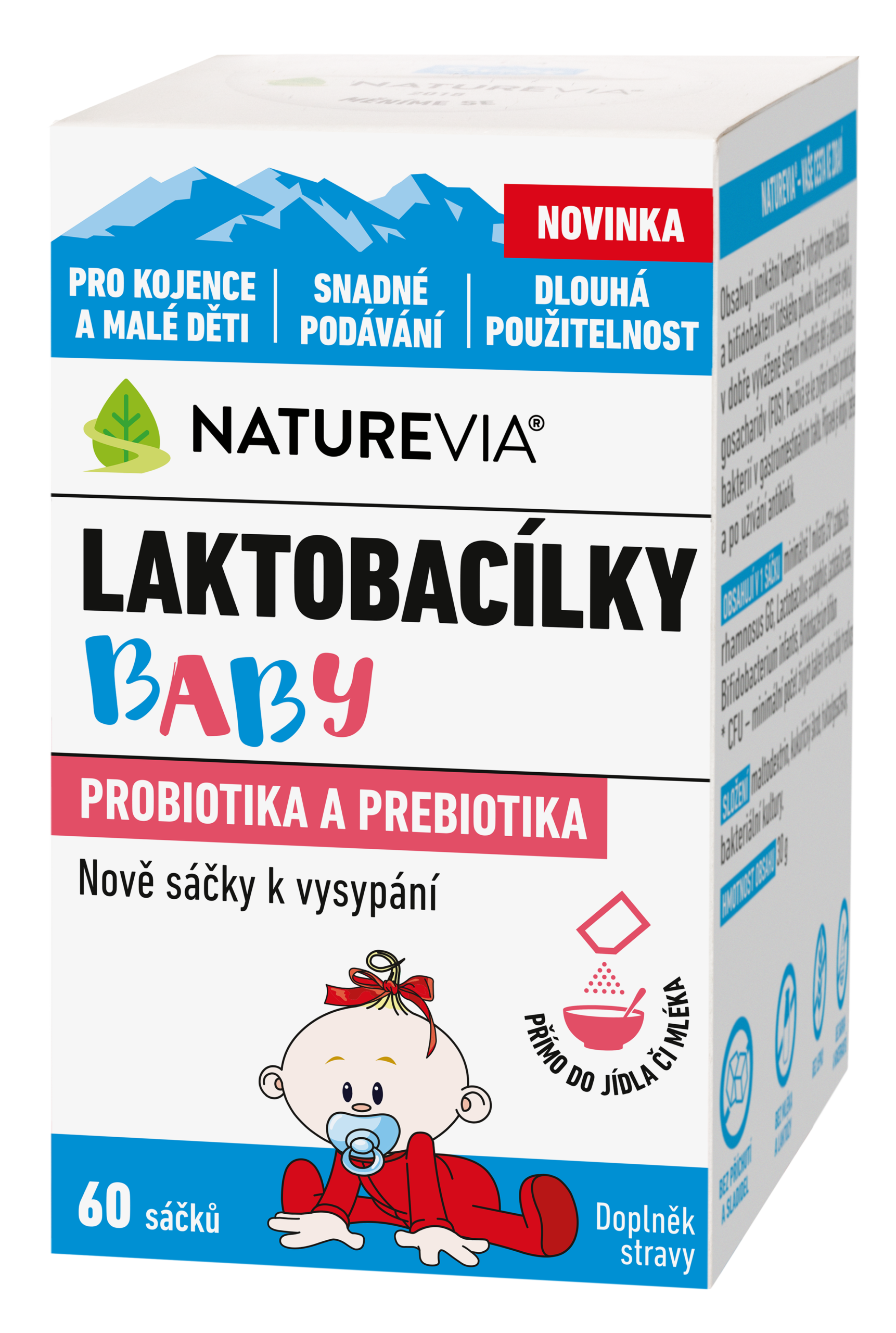 NatureVia Laktobacílky baby je doplněk stravy, který obsahuje obsahují unikátní komplex 5 vybraných kmenů laktobacilů a bifidobakterií lidského původu, které se přirozeně vyskytují v dobře vyvážené střevní mikroflóře malých dětí a prebiotika fruktooligosacharidy (FOS).