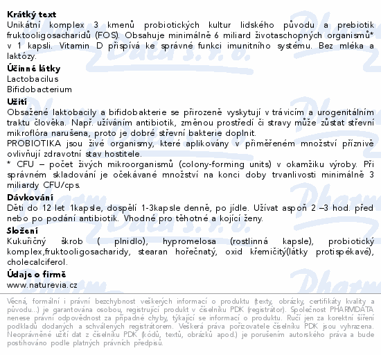 Unikátní komplex 3 kmenů probiotických kultur lidského původu a prebiotik fruktooligosacharidů (FOS). Obsahuje minimálně 6 miliard životaschopných organismů* v 1 kapsli. Vitamin D přispívá ke správné funkci imunitního systému. Bez mléka a laktózy.