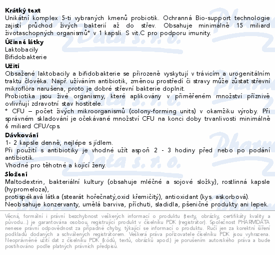 Unikátní komplex 5 vybraných kmenů laktobacilů a bifidobakterií lidského původu, které jsou přirozenou a nezbytnou součástí správně vyvážené střevní mikroflóry. S vitaminem C pro podporu imunity.