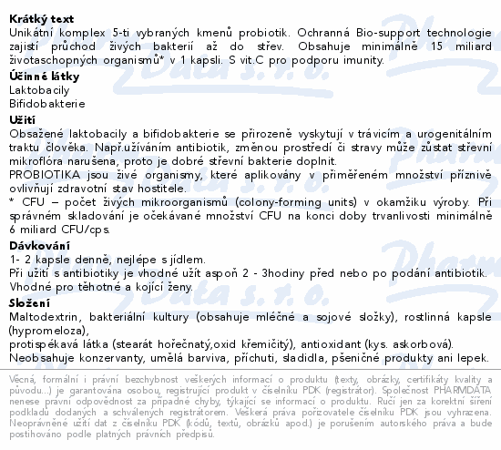Unikátní komplex 5-ti vybraných kmenů probiotik. Ochranná Bio-support technologie zajistí průchod živých bakterií až do střev. Obsahuje minimálně 15 miliard životaschopných organismů* v 1 kapsli. S vit.C pro podporu imunity.