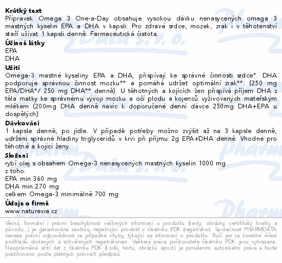 Omega-3 mastné kyseliny ve vysoké dávce pro maximální účinek na zdraví srdce, zraku a mozku jen s 1 kapslí denně! Přípravek Swiss NatureVia Omega 3 One a Day obsahuje vysoce čištěný olej z volně žijících ančoviček z ekologicky čistých oblastí Peru, které mají zvláště vysoký obsah omega-3 mastných kyselin.