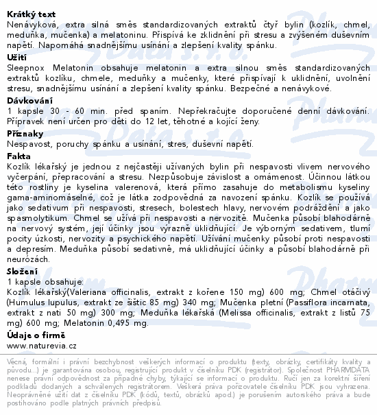 Nenávyková, extra silná směs standardizovaných extraktů čtyř bylin (kozlík, chmel, meduňka, mučenka) a melatoninu. Přispívá ke zklidnění při stresu a zvýšeném duševním napětí. Napomáhá snadnějšímu usínání a zlepšení kvality spánku.