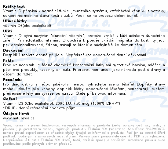 Obsah v jedné tabletě: Vitamin D3 (Cholekalciferol, 1000 I.U.) 25 mcg (500% RHP*).