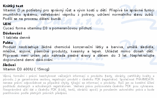 Jedna tableta obsahuje Vitamin D3 (cholecalciferol) (600 I.U.) 15 mcg (300%*)