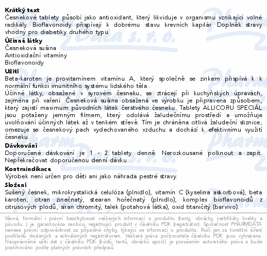Česnekové tablety působí jako antioxidant, který likviduje v organismu vznikající volné radikály. Bioflavonoidy přispívají k dobrému stavu krevních kapilár. Doplněk stravy vhodný pro diabetiky druhého typu.