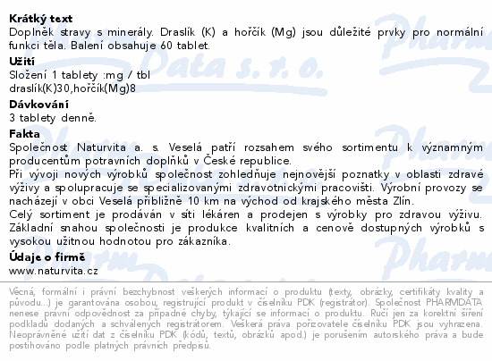 Doplněk stravy s minerály. Draslík (K) a hořčík (Mg) jsou důležité prvky pro normální funkci těla. Balení obsahuje 60 tablet.