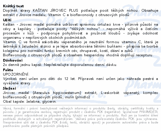 Doplněk stravy KAŠTAN JÍROVEC PLUS potlačuje pocit těžkých nohou. Obsahuje extrakt z Jírovce maďalu, Vitamin C a bioflavonoidy z citrusových plodů.