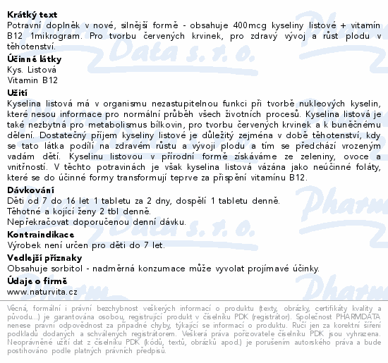 Potravní doplněk v nové, silnější formě - obsahuje 400mcg kyseliny listové + vitamín B12 1mikrogram. Pro tvorbu červených krvinek, pro zdravý vývoj a růst plodu v těhotenství.