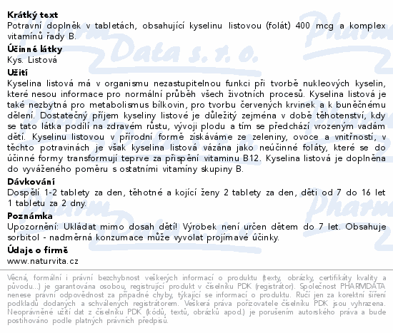 Potravní doplněk v tabletách, obsahující kyselinu listovou (folát) 400 mcg a komplex vitamínů řady B.