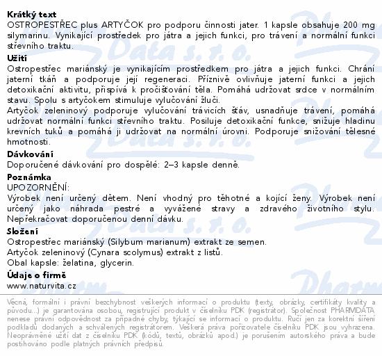 OSTROPESTŘEC plus ARTYČOK pro podporu činnosti jater. 1 kapsle obsahuje 200 mg silymarinu. Vynikající prostředek pro játra a jejich funkci, pro trávení a normální funkci střevního traktu.