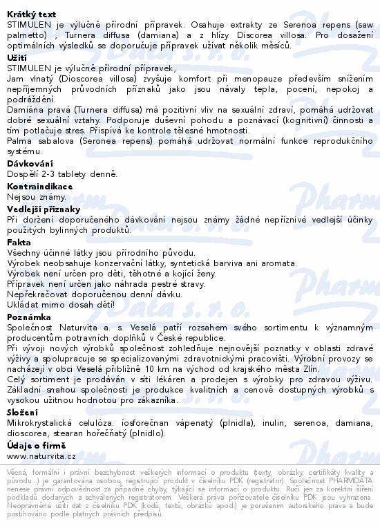 STIMULEN je výlučně přírodní přípravek. Osahuje extrakty ze Serenoa repens (saw palmetto) , Turnera diffusa (damiana) a z hlízy Discorea villosa. Pro dosažení optimálních výsledků se doporučuje přípravek užívat několik měsíců.