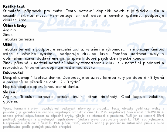 Stimulační přípravek pro muže. Tento potravní doplněk povzbuzuje fyzickou sílu a sexuální aktivitu mužů. Harmonizuje činnost srdce a cévního systému, podporuje cirkulaci krve.