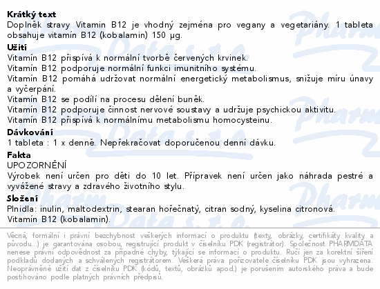 Doplněk stravy Vitamin B12 je vhodný zejména pro vegany a vegetariány. 1 tableta obsahuje vitamín B12 (kobalamin) 150 µg.