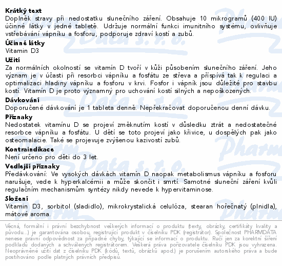 Doplněk stravy při nedostatku slunečního záření. Obsahuje 10 mikrogramů (400 IU) účinné látky v jedné tabletě. Udržuje normální funkci imunitního systému, ovlivňuje vstřebávání vápníku a fosforu, podporuje zdraví kostí a zubů.