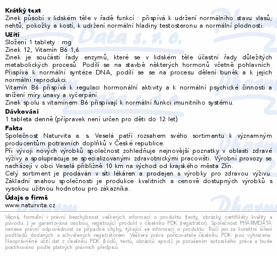Zinek působí v lidském těle v řadě funkcí : přispívá k udržení normálního stavu vlasů, nehtů, pokožky a kostí, k udržení normální hladiny testosteronu a normální plodnosti.