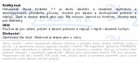Natusweet Stevia Kristalle 1:1 je stolní sladidlo s obsahem erythritolu a steviolglykosidů přírodního původu, vhodné pro slazení a dochucování potravin a nápojů. Sladí a chutná stejně jako cukr. Má nulovou kalorickou hodnotu. Vhodný také pro diabetiky.