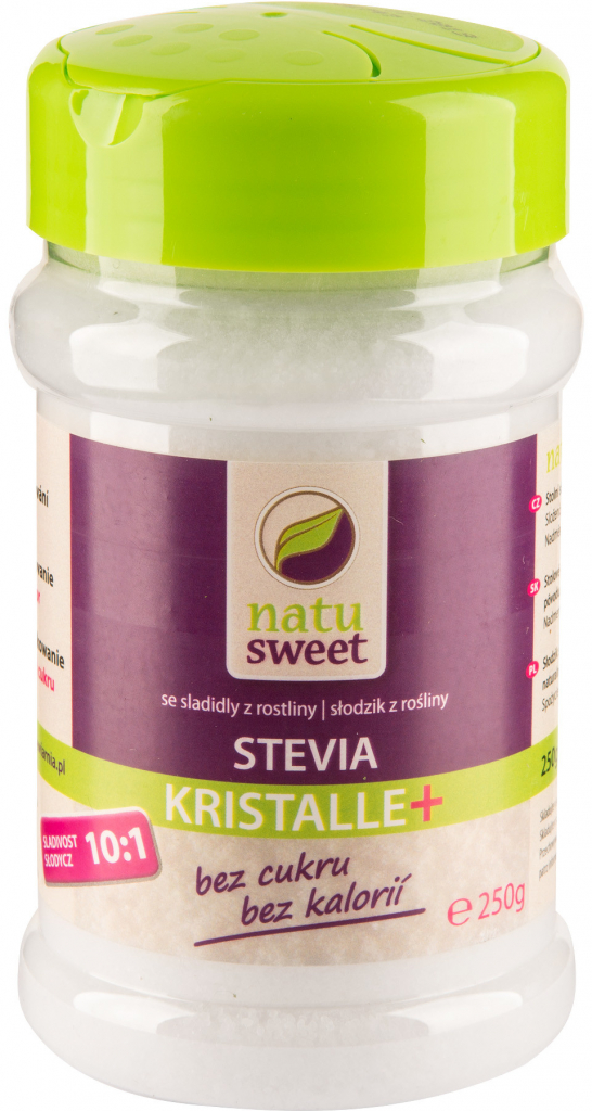 Stolní sladidlo přírodního původu z extraktů rostliny Stevia rebaudiana. Nekalorické, vhodné pro vaření a pečení. Natusweet Kristalle+ 10:1 je desetkrát sladší než cukr. 10 gramů Natusweet Kristalle+ 10:1 odpovídá 100 gramům cukru.