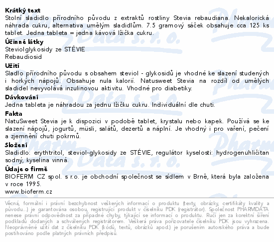 Stolní sladidlo přírodního původu z extraktů rostliny Stevia rebaudiana. Nekalorická náhrada cukru, alternativa umělým sladidlům. 7.5 gramový sáček obsahuje cca 125 ks tablet. Jedna tableta = jedna kávová lžička cukru.