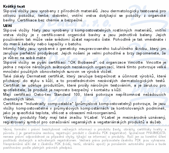 Slipové vložky jsou vyrobeny z přírodních materiálů. Jsou dermatologicky testované pro citlivou pokožku, tenké, diskrétní, vnitřní vrstva dotýkající se pokožky z organické bavlny. Certifikace bez chemie a bezpečné.