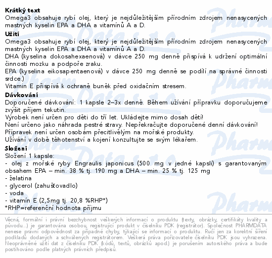Omega3 obsahuje rybí olej, který je nejdůležitějším přírodním zdrojem nenasycených mastných kyselin EPA a DHA a vitamínů A a D.
