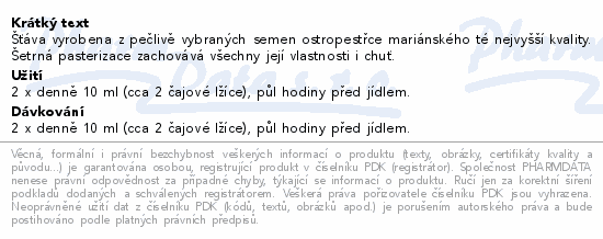 Šťáva vyrobena z pečlivě vybraných semen ostropestřce mariánského té nejvyšší kvality. Šetrná pasterizace zachovává všechny její vlastnosti i chuť.