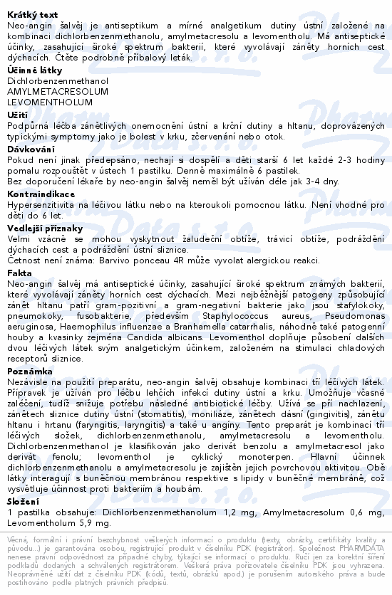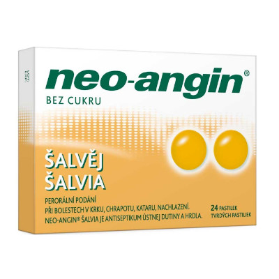 Neo-angin šalvěj je antiseptikum a mírné analgetikum dutiny ústní založené na kombinaci dichlorbenzenmethanolu, amylmetacresolu a levomentholu. Má antiseptické účinky, zasahující široké spektrum bakterií, které vyvolávají záněty horních cest dýchacích. Čtěte pozorně příbalový leták.