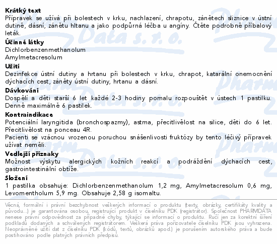 Léčivými látkami jsou Dichlorbenzenmethanolum (1,2 mg v 1 pastilce), Amylmetacresolum (0,6 mg v jedné pastilce), Levomentholum (5,9 mg v jedné pastilce). Pomocnými látkami jsou isomalt, kyselina vinná, třešňové aroma, silice máty peprné, ponceau 4R, indigokarmín.
